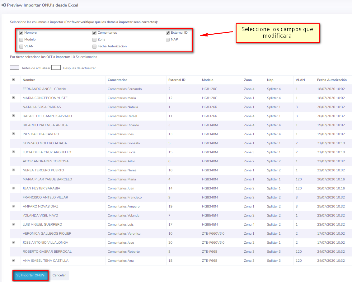 - Zona: Zona a la que pertenece la ONU. (Para cambiar este campo debe seleccionar zonas existentes en AdminOLTy escribirlos igual a como están en el sistema)