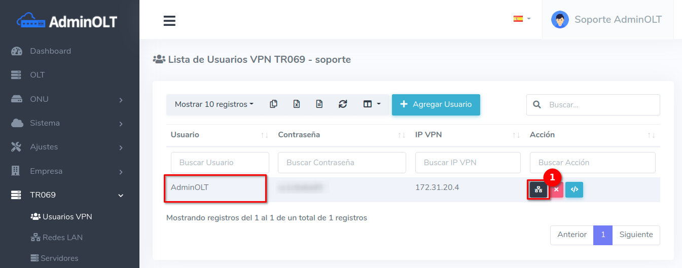 1Las redes LAN son asignadas a los usuarios VPN TR069, entonces debemos seleccionar el cliente al cual se le asignara/creara una nueva Red LAN. Nos colocamos en TR069 -> Usuarios VPN