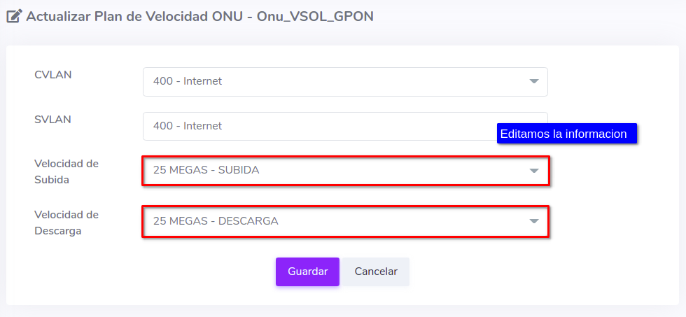 Cambiar de Plan de Velocidad a ONU Vsol