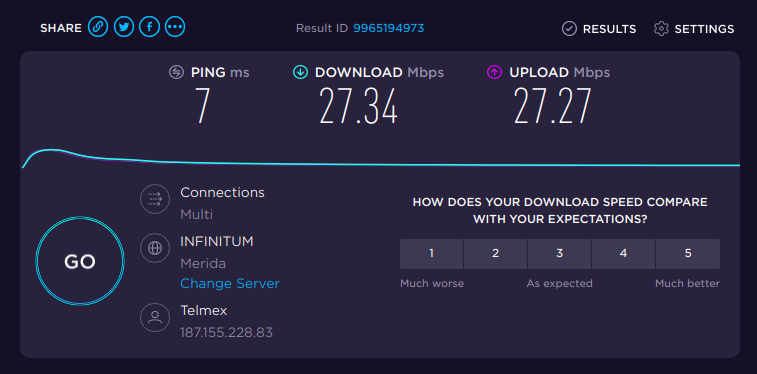 Si necesita consultar más a fondo si el cambio se aplico en la ONU puede consultar el siguiente sitio SpeedTest, recuerde que debemos estar conectados a la ONU al medir la velocidad. Ejemplo del resultado: