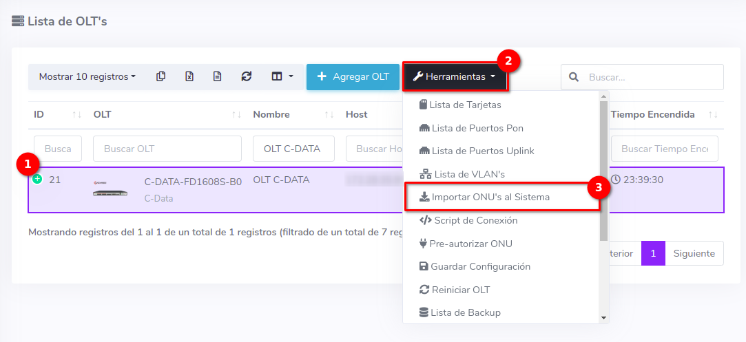 1En la Lista OLT's seleccionamos el equipo con el que trabajaremos para después ir a Importar ONU's al Sistema, que se encuentra en el botón con la leyenda Herramientas.