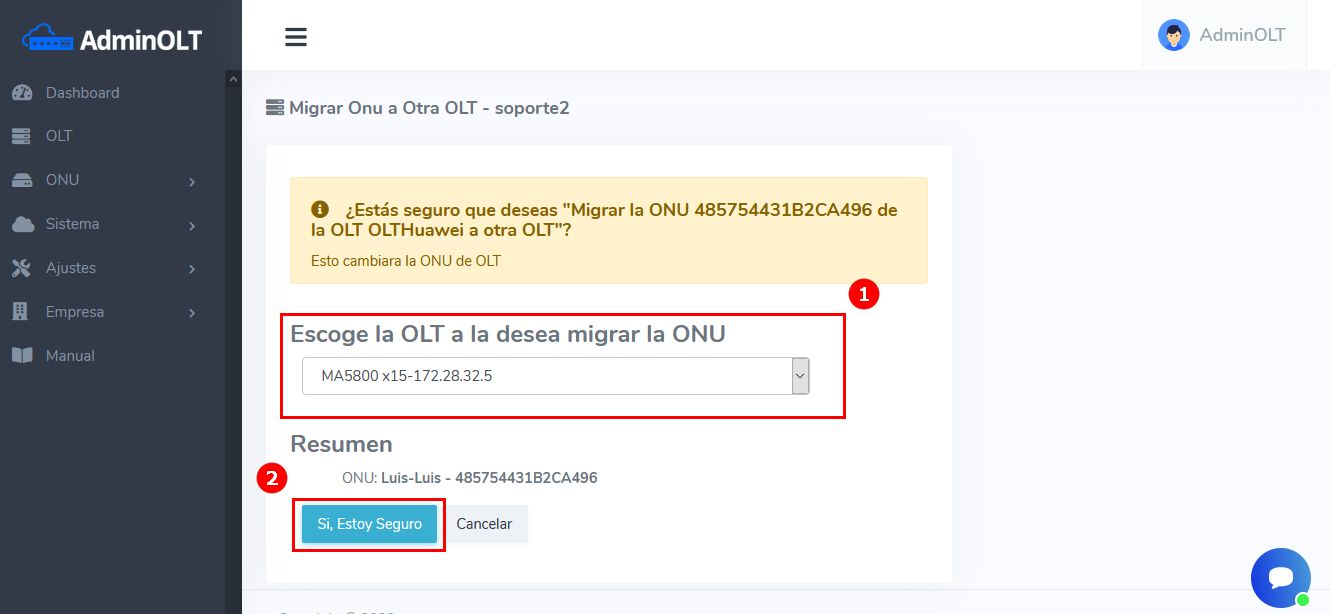 3Se nos redirigirá a otra pestaña donde vamos a escoger la OLT a la que queremos migrar esa ONU y aceptamos el cambio.