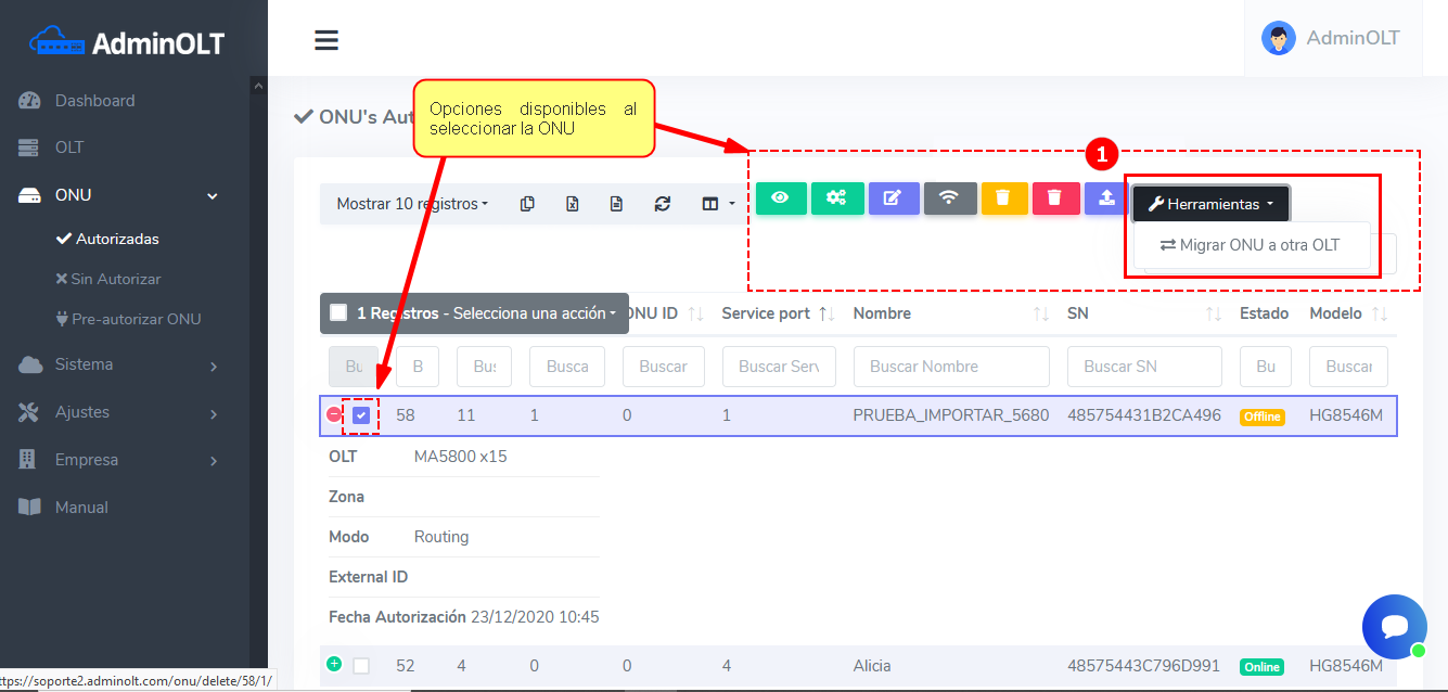 2Una vez seleccionada la ONU saldrá una cinta de opciones y funciones, donde podrá encortar en Herramientas la función de Migrar ONU a otra OLT.
