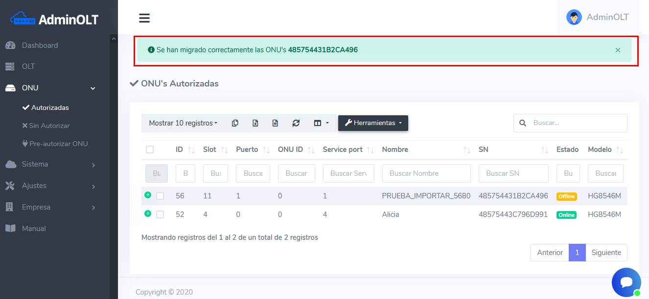 4Se confirma el cambio que la ONU se ha migrado de OLT.