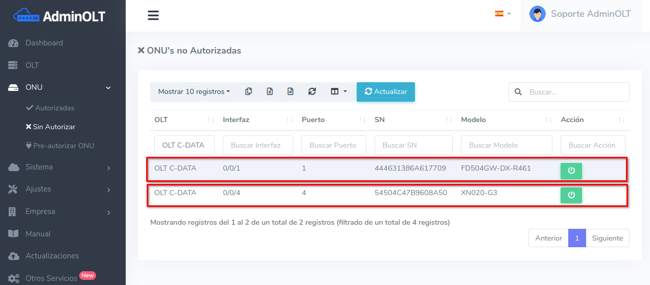 Una vez autorizada la ONU podrán modificar sus planes de velocidad y vlans asociados a los servicios desde la Lista de planes de velocidad.