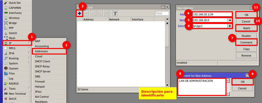 Nos dirigimos al apartado de Bridge en el menú de nuestro RouterBoard para generar la interfaz bridge1 y así poder agrupar los puertos que estarán trabajando en la red de la OLT.