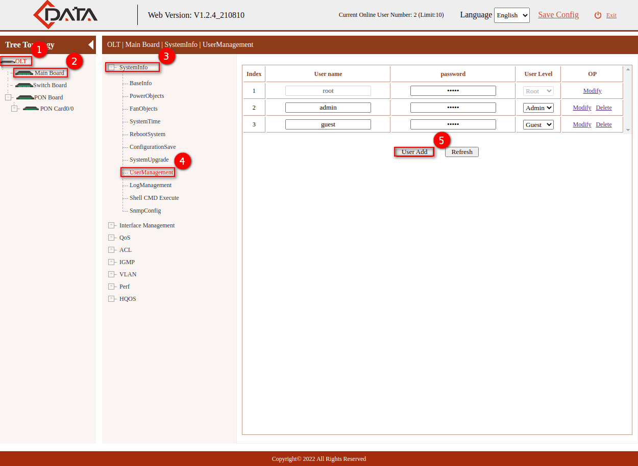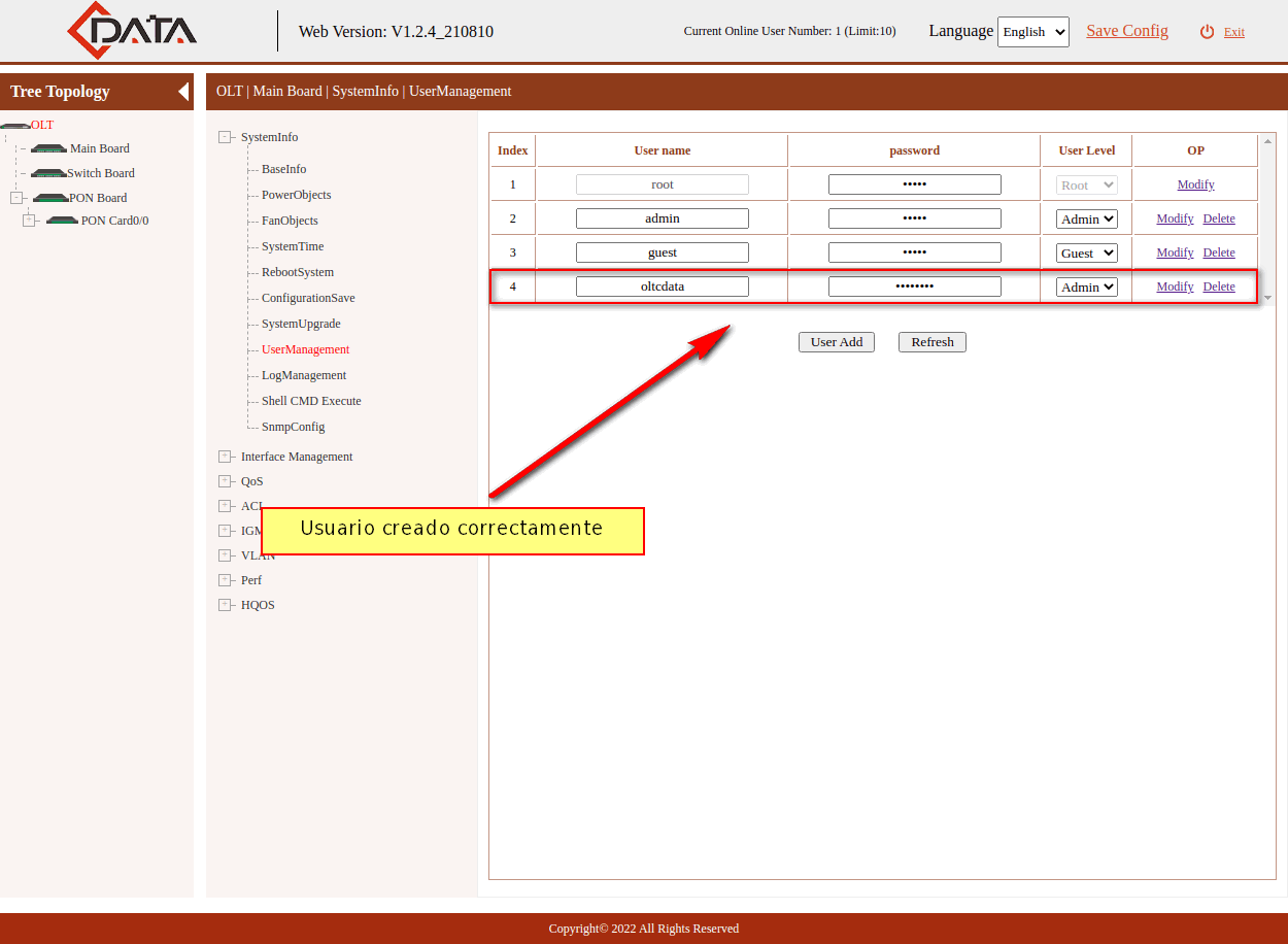 7 Creamos un usuario en la OLT, el cual nos servirá para conectarlo con AdminOLT