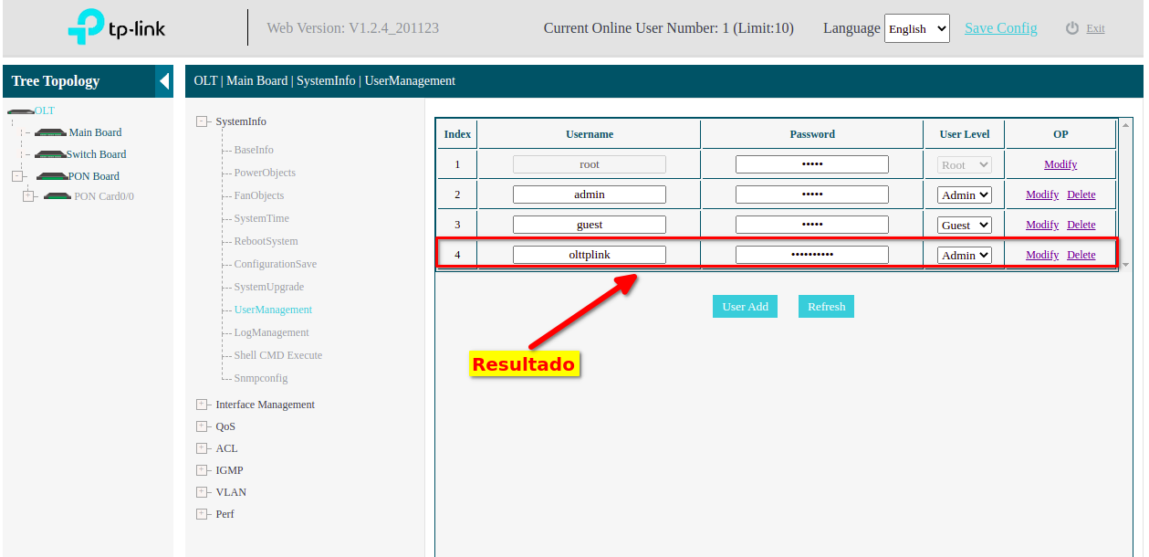 7 Creamos un usuario en la OLT, el cual nos servirá para conectarlo con AdminOLT