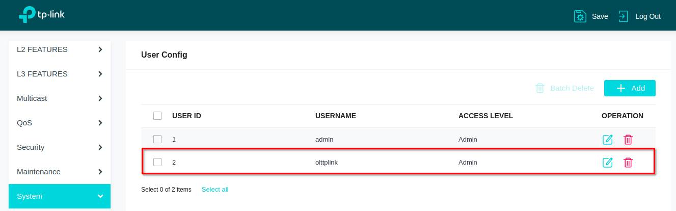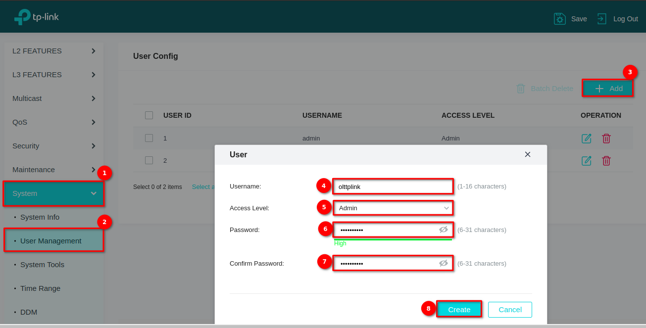 7 Creamos un usuario en la OLT, el cual nos servirá para conectarlo con AdminOLT