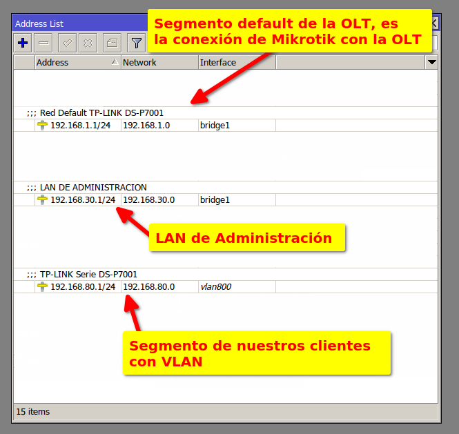 2 Debemos tener agregadas nuestro Vlan, LAN De Administración y LAN de Segmento de Clientes. Para más información puede leer el manual Configuración en RouterBoard MikroTik para OLT TP-LINK Serie DS-P7001
