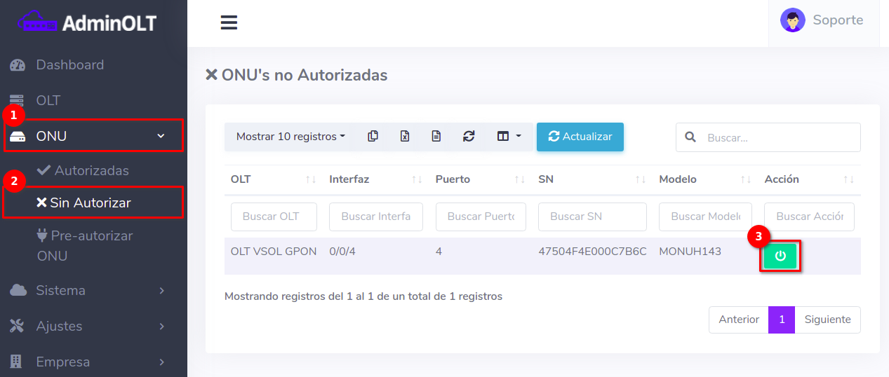 Al hacer esto, la configuración se borrara de la ONU y del sistema AdminOLT.