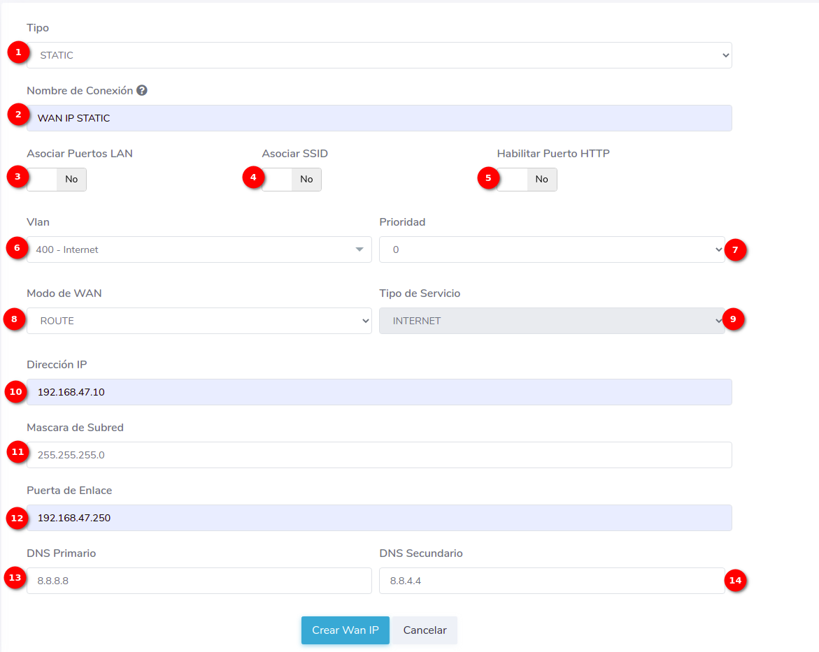 - ¿Cómo crear una configuración WAN IP de tipo STATIC?