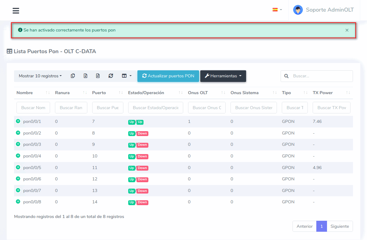 3 Una vez que se termine el proceso podremos ver en la vista la lista de puertos disponibles en nuestra OLT.