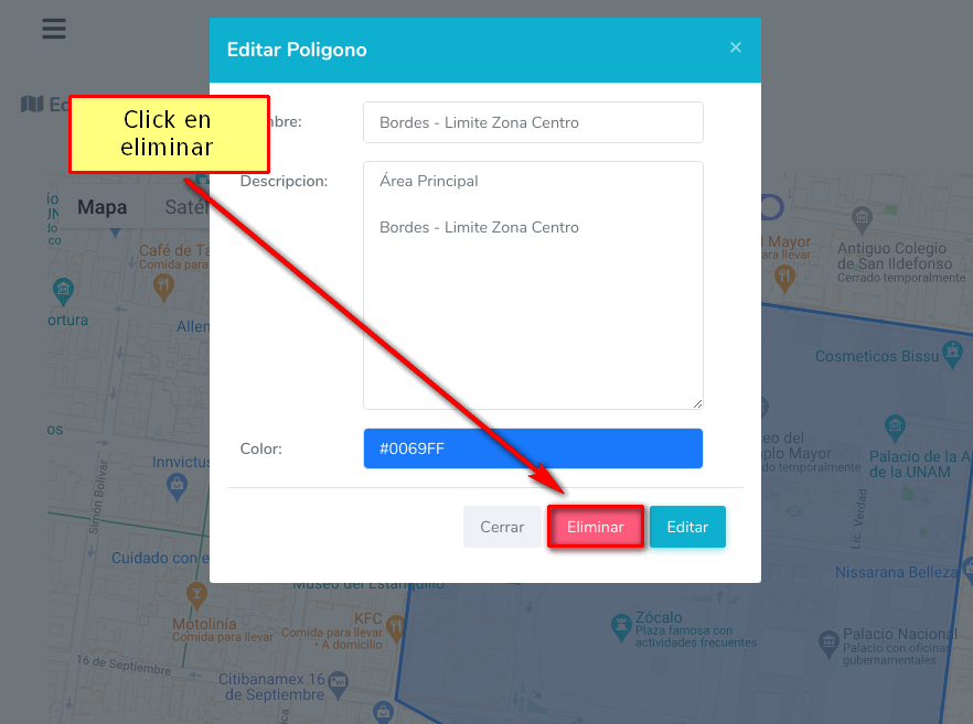 Si desea eliminar una Geozona, favor de seguir los pasos siguientes