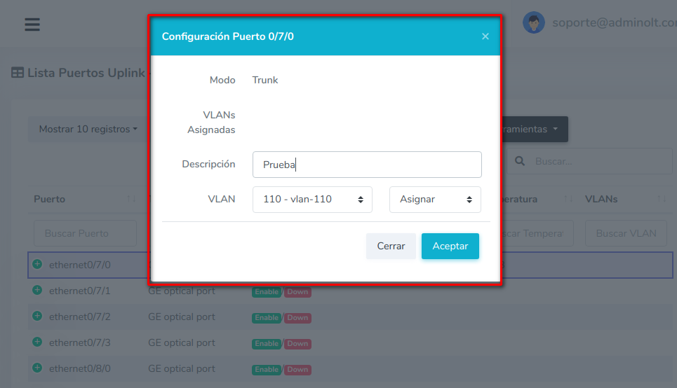 5Asignamos la VLAN definida anteriormente para establecer la conexión.