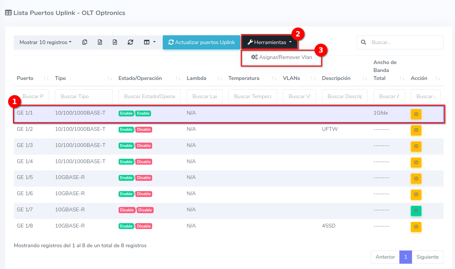 1 En la Lista OLT's seleccionamos el equipo con el que trabajaremos para después ir a Puertos Uplink, que se encuentra en el botón con la leyenda Herramientas.