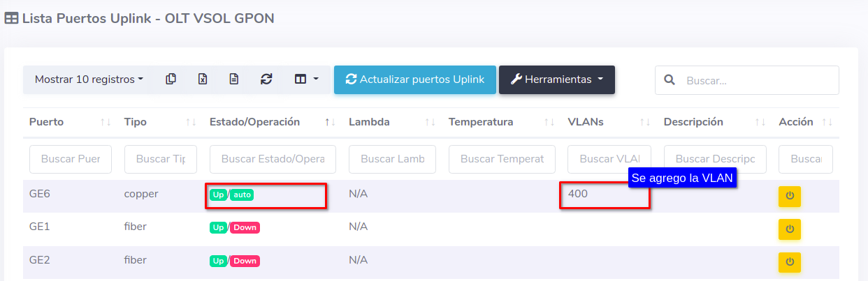 1En la Lista OLT's seleccionamos el equipo con el que trabajaremos para después ir a Puertos Uplink, que se encuentra en el botón con la leyenda Herramientas.