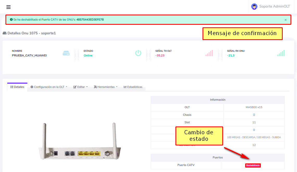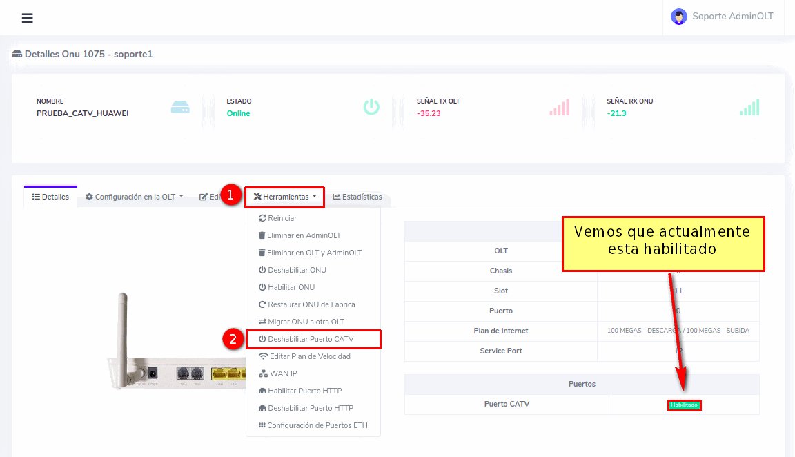Desde AdminOLT se puede habilitar o deshabilitar el puerto CATV de las ONU's. Para esto puede seguir los siguientes pasos