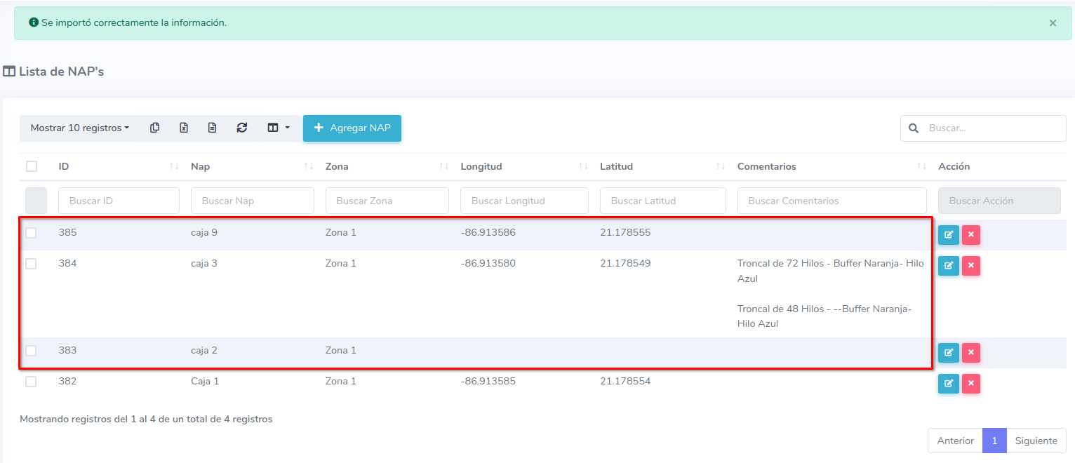 4Al terminar de verificar los datos puede elegir una o todas las Naps para importar.