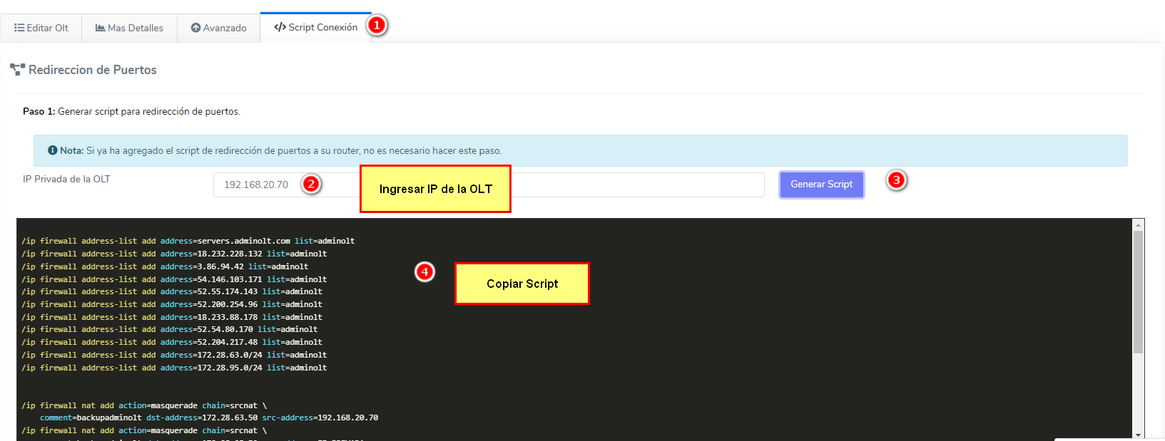 3Después hay que hacer la redirección de puertos, para ello hay que tener la ip con la que se ingresa a la OLT por Telnet para generar el script, para ello nos dirigimos al apartado de Scrip de conexión e ingresamos la IP en el campo de IP privada, le damos en Generar script y lo copiamos.